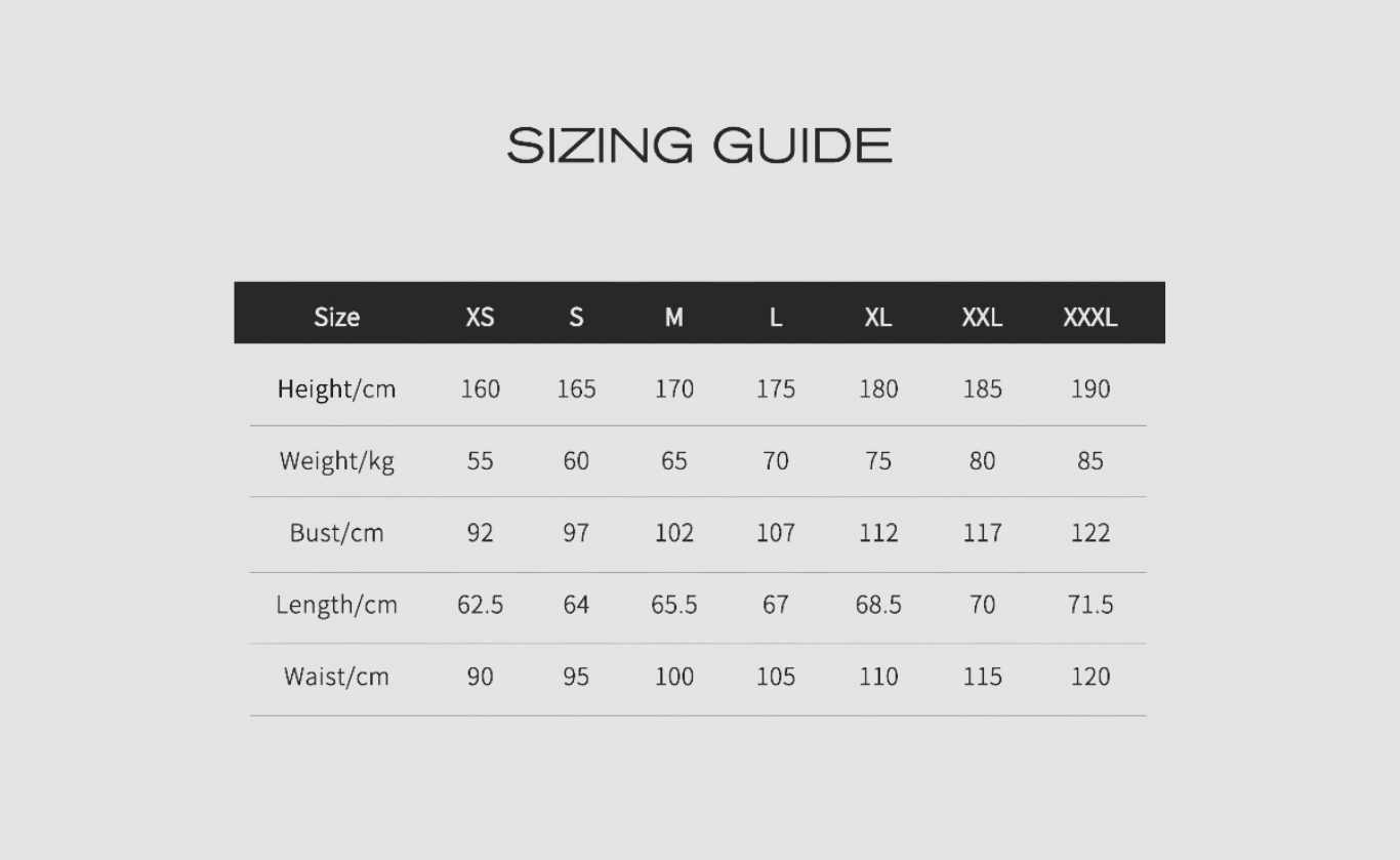 | Size | Height | Chest/CM | Shoulder Width/CM | Length/CM |