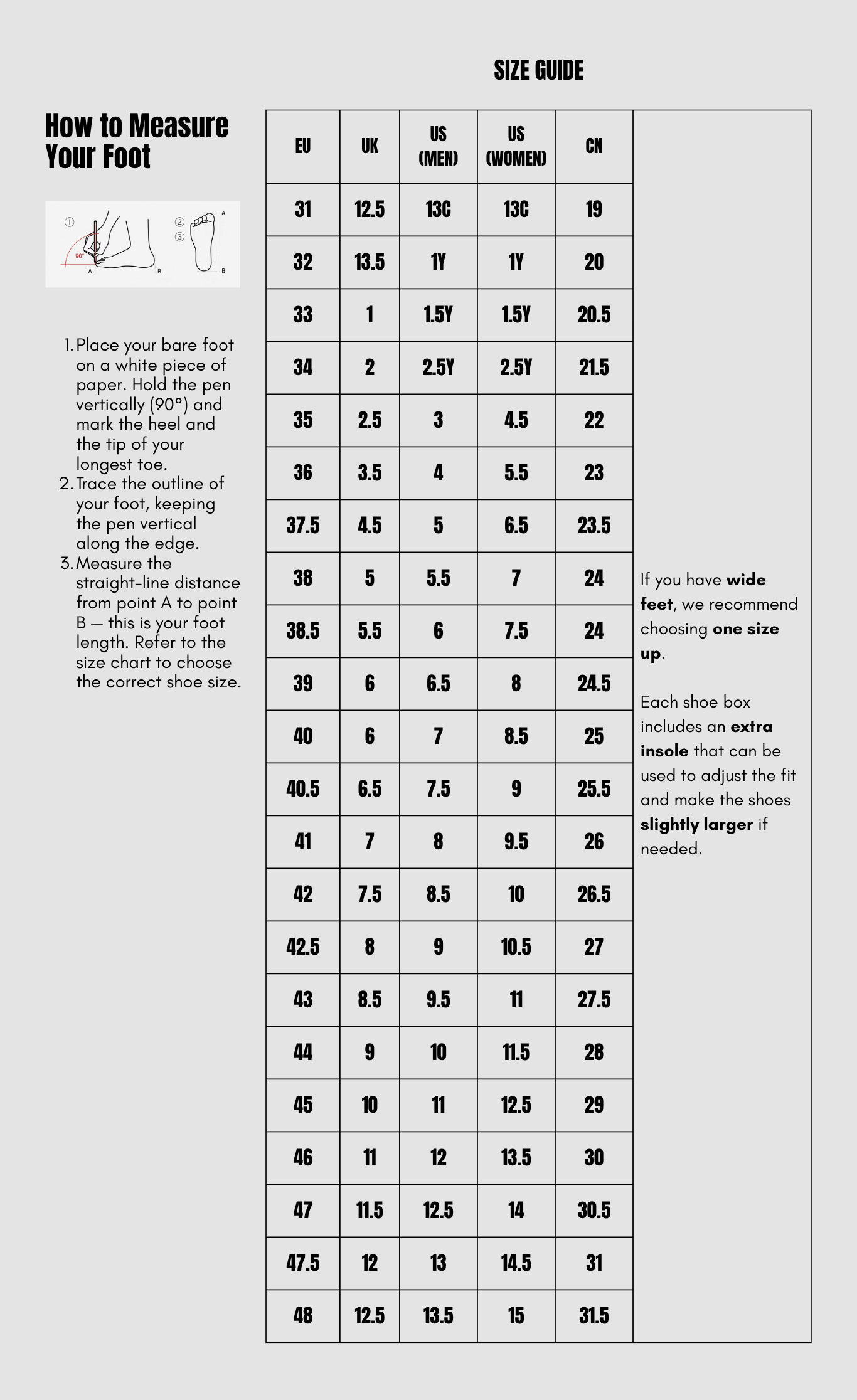 | EU | US MEN | US WOMEN | UK | CHN | FOOT LENGTH/MM |